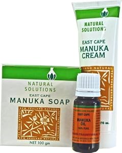 Set contains one each Naturals New Zealand Pure Manuka Oil (catalog number EC01), Manuka Oil Soap (catalog number MS01), and Manuka Oil Cream (catalog number EC02). Manuka Oil soothes irritation. Harvested from manuka tress grown in the wild without the use of artificial chemicals. Rich in triketones, and each batch is tested for levels of these compounds. Buy as a set for the entire family.