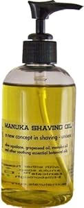 Manuka Shaving Oil 8 fl.oz./236 ml. A new concept in shaving - Unisex. This non-foaming shaving oil contains manuka oil, olive squalane and soothing essential oils. This 100%-natural product reduces razor burns and irritation, and provides an effective antiseptic and hydrating skin barrier. Our tests indicate that this oil is far superior to shaving soaps.